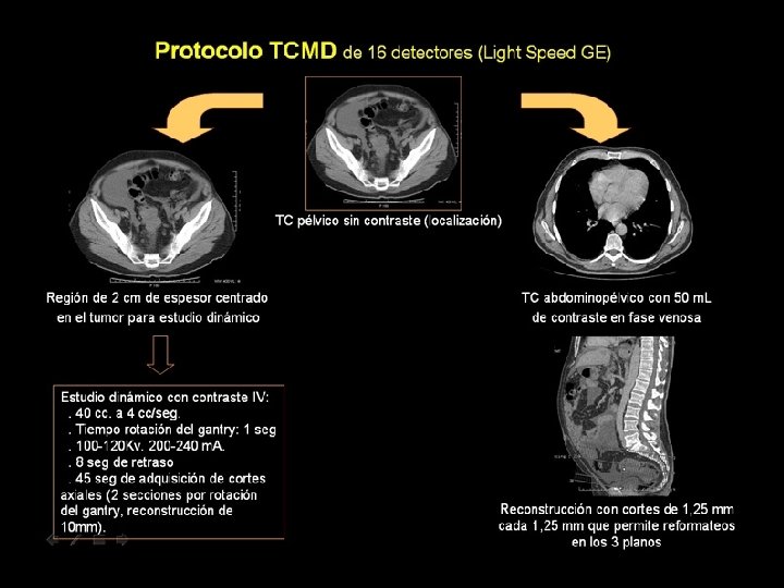 TC Perfusión. Técnica • TCMD de 16 canales (Light Speed GE). • TC pélvico sin contraste (localización) • Región de 2 cm. de espesor para estudio de cine Estudio dinámico inyectando contraste IV: 40 cc. a 4 cc/sg. Tiempo rotación del gantry: 1 sg. 100 -120 Kv. 200 -240 m. A. 8 sg. de retraso 45 s de adquisión de cortes axiales (2 secciones por rotación del gantry, reconstrucción de 10 mm. )