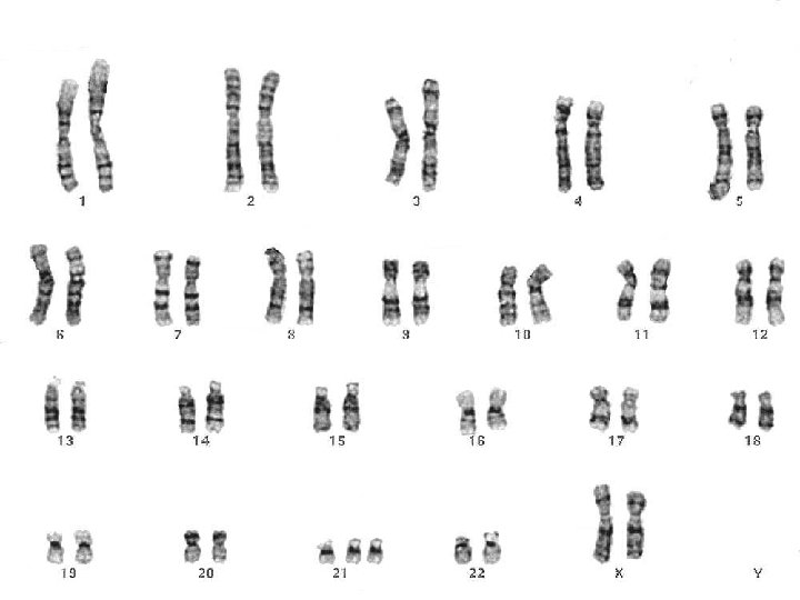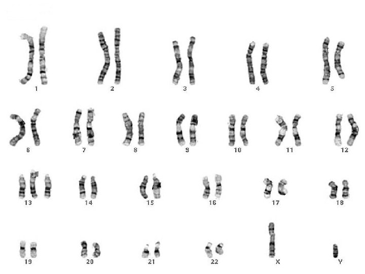 Cariotipo Humano • La dotación cromosómica normal de la especie humana es de 46, XX para las mujeres y de 46, XY para los varones • En el cariotipo humano los cromosomas se ordenan de mayor a menor. Hay cromosomas grandes, medianos y pequeños. Al ordenar los comosomas se constituyen 7 grupos atendiendo no sólo al tamaño sino también a la forma de las parejas cromosómicas, dentro del cariotipo humano podemos encontrar cromosomas metacéntricos (tienen los dos brazos aproximadamente iguales en longitud), submetacéntricos (con un brazo más pequeño que otro) y acrocéntricos (con un brazo corto muy pequeño).