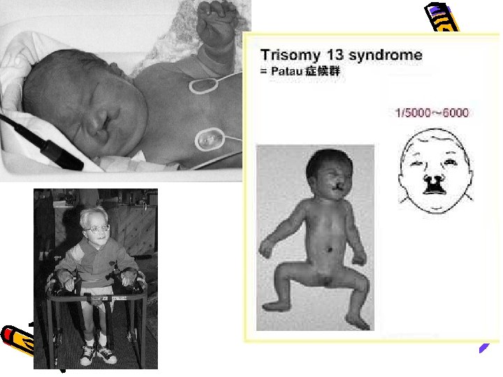 Síndrome Patau 47, +13 Profundo retraso mental, fisura labiopalatina y polidactilia, Malformaciones en muchos sistemas orgánicos. Mueren a los 6 meses y la mayoría son varones. Edad promedio de padres 32 años. 1/20, 000 nacimientos