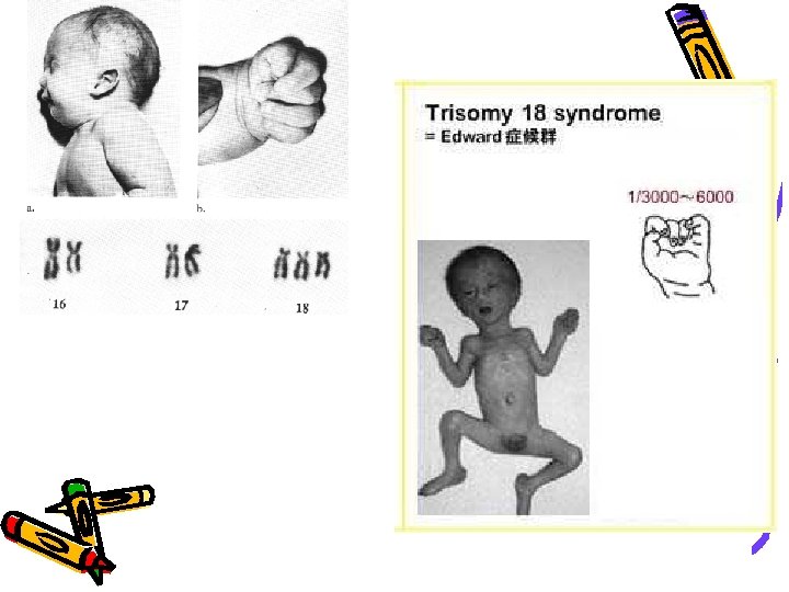 Síndrome Edwards 47, +18 Niños + pequeños, cráneos alargados, orejas faunescas, cuello ancho, dislocación congénita de las caderas, mentón deprimido. Ecabalgamiento de los dedos Viven menos de 4 meses, mueren por neumonía o fallo cardíaco Edad materna alta 34. 7 años, bebés mayormente hembras, se presenta 1/8000 nacidos