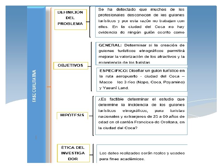CONCLUSIONES • Los guiones turísticos etnográficos, tienen gran incidencia para atraer turistas • Se pudo evidenciar mediante encuestas que aún falta mucho por mejorar en cuanto al manejo de turistas y difusión profesional de la información que algunos guías manejan. • La falta de capacitación e inclusión de los guías, a afectado tanto a la historia como a la cultura de la ciudad El Coca, lo cual comprende una parte importante de turismo que debería ser destacada. • Los guiones deben ser implementados en aquellas empresas y actividades de turismo, como materiales de trabajo para uso de todos los guías, como su herramienta de soporte. • Se identificó la necesidad de implementar y potenciar el uso de los guiones como herramienta de trabajo para los guías.