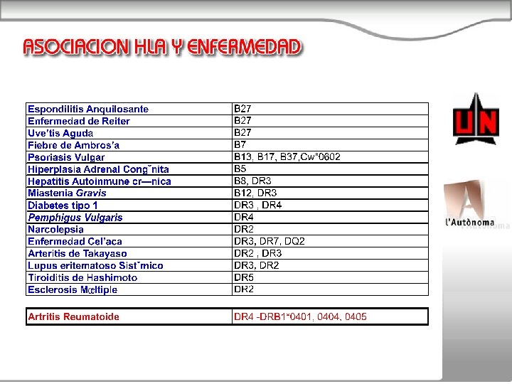 • La artritis reumatoide (AR) esta asociada a DR 4 • La asociación se da con los subtipos DRB 1*0401, 0404 y 0405 • En algunas poblaciones se ha observado asociacion con DR 1 (B 1*0101), DR 10 (B 1*1001) y DRB 1*1402