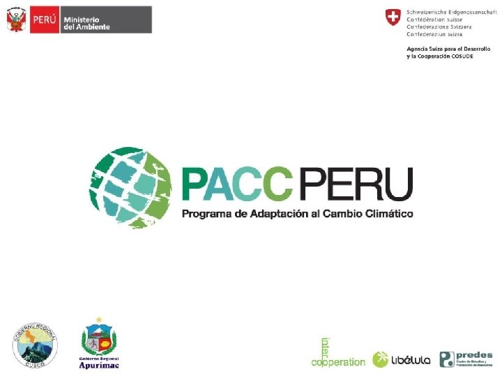 Estudios del PACC • • • Agua – Oferta hídrica superficial actual y futura (SENAMHI) – Demanda hídrica superficial actual y futura (IMA) – Gestión y conflictos del agua (CBC) Productivos – Sistemas productivos y culturales: Una percepción desde la población (PREDES y CBC) – Agroclimatología y fenología de cultivos (SENAMHI) Clima – Caracterización climática y escenarios climáticos (SENAMHI) Desastres – Riesgos de eventos de remoción en masa (PREDES) Valoración – Esc. socioeconómicos y valoración de medidas de adaptación (Libélula)