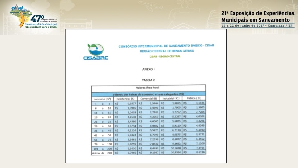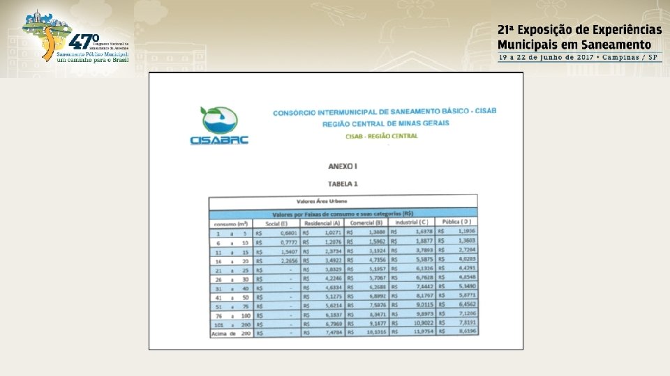 CONCLUSÃO Neste trabalho, se constatou que o CISAB-RC exerce efetivamente a regulação e fiscalização em âmbito do SAAE de Itabirito, desempenhando um papel decisivo no cálculo tarifário, onde apenas por critérios técnicos de ordem econômica se reajustou o valor da tarifa vigente, apresentando a memória de cálculos e sua fundamentação na Nota Técnica CISAB-RC nº 04/2015. Quanto aos critérios qualitativos da prestação dos serviços e adequação às exigências do Código de Defesa do Consumidor, o consórcio por meio da RESOLUÇÃO DE FISCALIZAÇÃO E REGULAÇÃO – CISAB-RC Nº 013, fixou os parâmetros mínimos de atendimento à população, garantindo assim que os serviços sejam prestados de forma satisfatória.