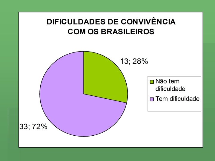 MOTIVOS DAS DIFICULDADES DE CONVIVÊNCIA: § Não é generalizado, mas os brasileiros debatem constantemente sobre temas corriqueiros e pré-conceitos no sentido puro da palavra, ou seja, não se trata de discriminações, mas de senso comum deturpado e opiniões sem fundamentação; § A língua e o jeito de se comunicar; § O preconceito cria uma grande barreira no convívio e de adaptação à sociedade brasileira; § A dificuldade de se expressar em português e de fazer uso correto da ortografia e fonética da língua portuguesa; § A relação humana; § A diferença de cultura; dos costumes; do clima; os hábitos; § Costume de assistir novelas e futebol;