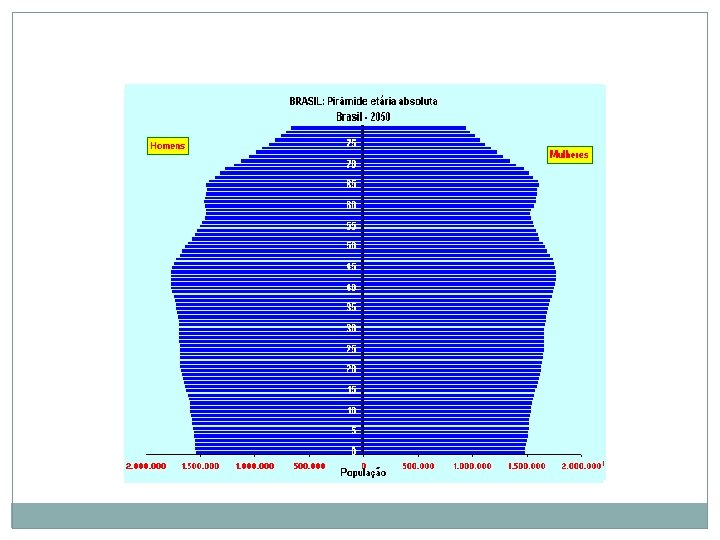 Distribuição etária Population Structures by Age and Sex, 2005 Millions Less Developed Regions More Developed Regions Age Male Female 80+ 75 -79 70 -74 65 -69 60 -64 55 -59 50 -54 45 -49 40 -44 35 -39 30 -34 25 -29 20 -24 15 -19 10 -14 5 -9 0 -4 Male Source: United Nations, World Population Prospects: The 2004 Revision, 2005. Female