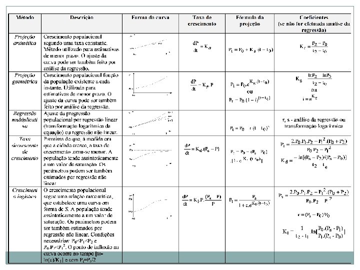 Projeção aritmética: • Crescimento populacional segundo uma taxa constante; • Método utilizado para estimativas de menor prazo; • O ajuste da curva pode ser feito por análise da regressão. • Fórmula da projeção Pn = P 0 + (n-0). ra ra ti • Taxa de crescimento = razão ra = Pn – P 0 tn – ti