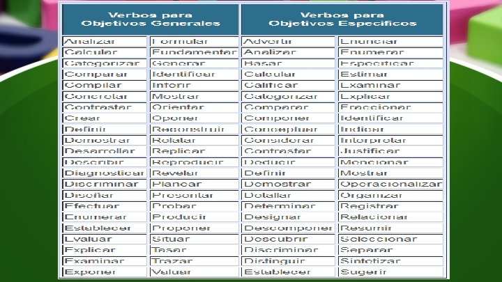 • Los objetivos, por tanto, representan las guías del estudio y su alcance es determinante para el investigador. Deben expresarse con claridad y susceptibles de ser alcanzados. Por otra parte, vienen dados en función del título y el planteamiento del problema y son declaraciones relativas a ¿qué? , ¿cómo? , ¿para qué? se tomó esa situación o problema en particular para desarrollar la investigación. • Deben ser redactados en tiempo infinitivo (por ejemplo: determinar, analizar, verificar, entre otros) y la intención del investigador es el logro de los mismos. Es conveniente plantearse solamente aquellos objetivos de los cuales se tiene certeza de su cumplimiento. • Se recomienda no utilizar los siguientes verbos: conocer y comprender, ya que pueden considerarse ambiguos y su interpretación puede confundir al lector.
