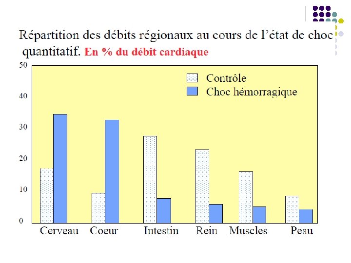 Choc décompensé Les mécanismes compensatoires ne sont plus en mesure de faire face aux besoins des tissus. Chûte de la PA Donc hypoxie tissulaire, métabolisme anaérobie : chute de la production d’ATP et production de lactates. Chute du p. H (acidose métabolique) Information du SNC (chémorécepteurs) Vaso. C intense de la peau, des muscles striés et des viscères : pâleur, marbrures, en vue d’une redistribution vers les organes nobles.
