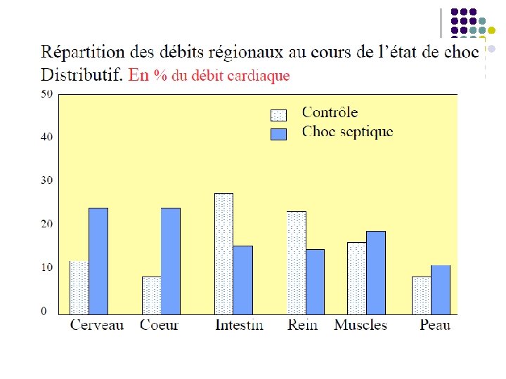 Mortalité hospitalière > 30% (30 -60%) Surtout BGN et Cocci G+ Endotoxine ou Exotoxine bactérienne libération de médiateurs de l’inflammation (cytokines, C, PAF, Histamine, Kallicréine, NO) Atteinte de la micro-circulation = dérégulation des débits sanguins régionaux Atteinte des cellules musculaires lisses vasculaires vasodilatation artérielle et veineuse Lésions de l’endothélium vasculaire = exsudation plasmatique hypovolémie + œdème interstitiel aggravant l’hypoxie tissulaire Emballement de la coagulation : CIVD Adaptation initiale par augmentation du débit cardiaque Puis effet inotrope négatif direct retardé