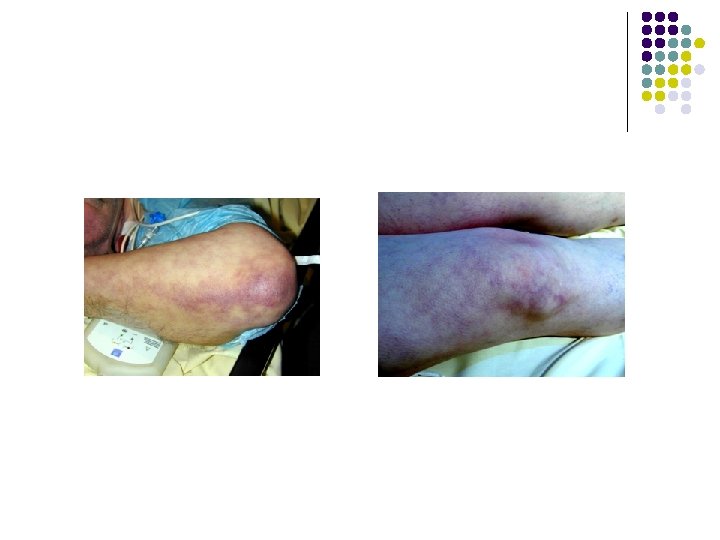 Vasoconstriction cutanée Marbrures (genoux ++), temps de recoloration cutané allongé (>3 s), extrémités froides, teint livide, sueurs Mais attention les extrémités peuvent être chaudes (1ère phase du choc septique, choc anaphylactique)