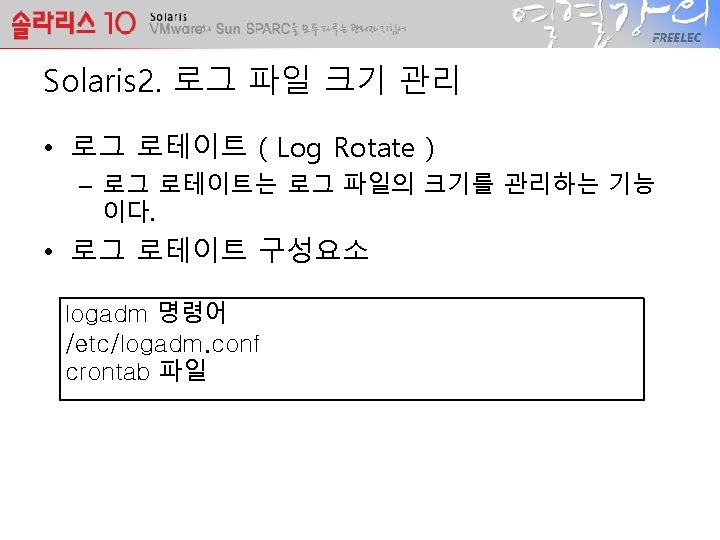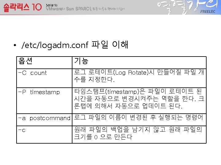 etclogadm conf cat etclogadm conf grep v varlogsyslog Slides: 8 Download presentation • /etc/logadm. conf 파일 # cat /etc/logadm. conf | grep -v '^#' /var/log/syslog -C 8 -P 'Wed Feb 25 2009' -a 'kill -HUP `cat /var/run/syslog. pid`' /var/adm/messages -C 0 -P 'Wed Feb 25 2009' -a 'kill -HUP `cat /var/run/syslog. pid`' /var/cron/log -P 'Fri Sep 12 2008' -c -s 512 k -t /var/cron/olog /var/lp/logs/lpsched -C 2 -N -t '$file. $N' /var/fm/fmd/errlog -M '/usr/sbin/fmadm -q rotate errlog && mv /var/fm/fmd/errlog. 0 - $nfile' -N -s 2 m /var/fm/fmd/fltlog -A 6 m -M '/usr/sbin/fmadm -q rotate fltlog && mv /var/fm/fmd/fltlog. 0 - $nfile' -N -P 'Fri Sep 12 2008' -s 10 m smf_logs -C 8 -s 1 m /var/svc/log/*. log /var/adm/pacct -C 0 -N -a '/usr/lib/accton pacct' -g adm -m 664 -o adm -p never /var/log/poold -N -a 'pkill -HUP poold; true' -s 512 k syslog -P 'Fri Sep 12 2008'