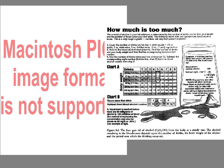 Example: Find the BAC for 128 lb. male drinking 12 oz. beer (4. 5 percent alcohol by volume) in one hour's time. A. B. Convert pounds to kilograms: 128 lbs / (2. 2046 lbs/kg) B. Find total body water: 58. 06 kg. x. 58 = 33. 675 liters or water C. Determine the weight in grams of 12 oz. Of 4. 5% alcohol: = 58. 06 kg. 33, 675 milliliters 12 oz. x. 045 x 29. 57 ml/oz x 0. 79 g/ml = 23. 36 grams D. If we put 1 oz. of alcohol into the subject's total body water, we would have grams of alcohol/ml. of water, e. g. , 23. 36 grams ÷ 33, 675 milliliter =. 0006937 grams alcohol/ml of water E. We now want to find the alcohol concentration in the blood. Blood is composed of 80. 6 percent water; therefore, . 0006937 X. 806 =. 000559 grams alcohol/milliliter blood.