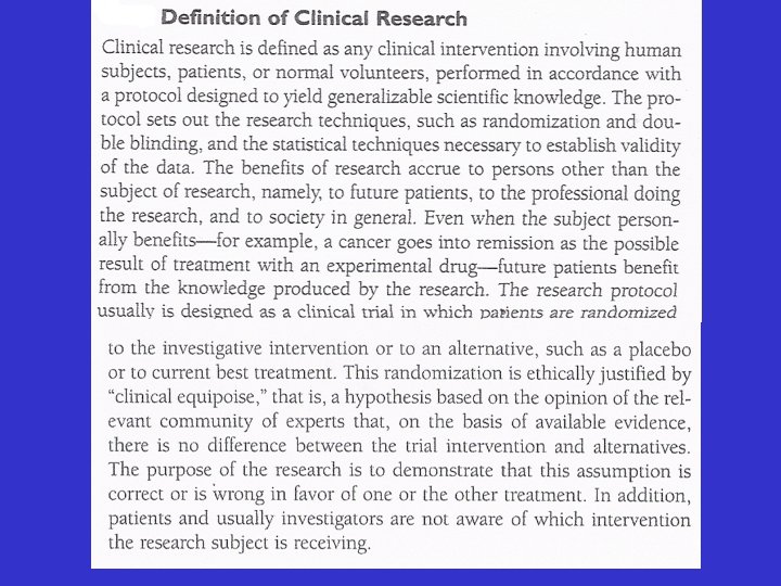 Innovative treatment Most clinical activity involves familiar procedures and medications, many of which have never undergone the close scrutinity of a formally designed clinical trial. Their efficacy is attested only by cumulative experience. New treatments are constantly being devised by commercial firms and by individual physicians.