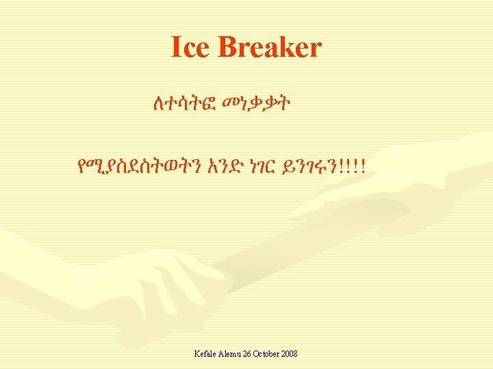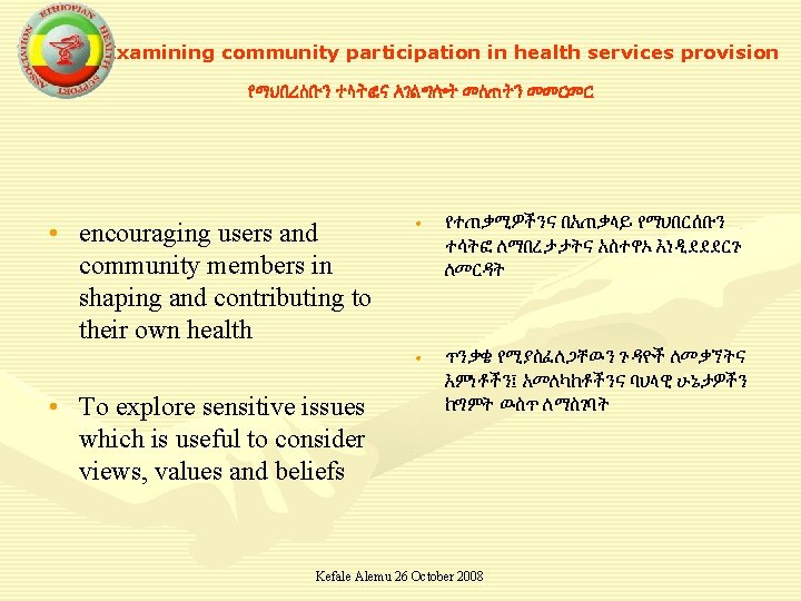 How do community members participate to deliver the existing services? አሁን በመካሄድ ላይ የሚገኙትን ነገልጌሎቶች የማህበረሰባችን አባላት እንዴት ተድረገዉ በመሳተፍ ሊሰጡ ይችላሉ Discussions and suggestions by community members (task 2) ዉይይት!!! Kefale Alemu 26 October 2008