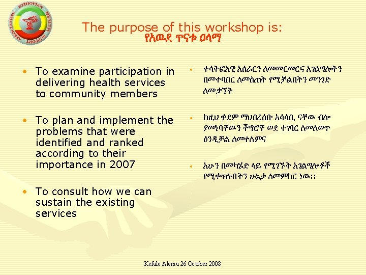 Ethiopian Health Support Association Participatory Health workshop 08 Kefale Alemu 26 October 2008