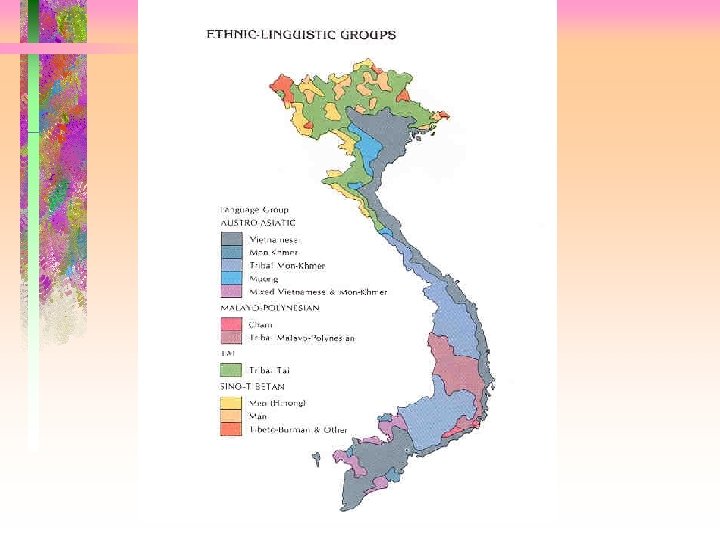 Vietnam • Most minorities live in the hills/mountains EXCEPT Hoa, Khmer (Cambodian) and Cham. • In Northern mountains territory is not fixed and different groups are interspersed. • The languages of the 54 groups belong to 5 different language families.