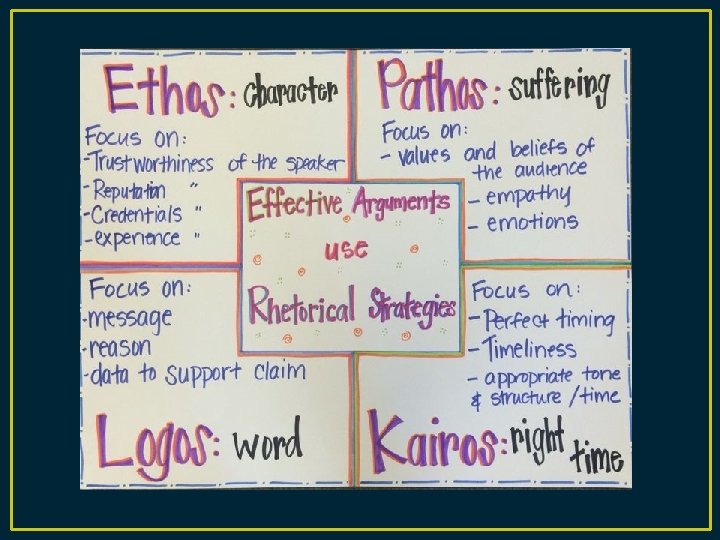 What is Rhetoric? • Rhetoric (n) - the art of speaking or writing effectively (Webster's Definition). • According to Aristotle, rhetoric is "the ability, in each particular case, to see the available means of persuasion. " He described four main forms of rhetoric: Ethos, Logos, Pathos, and Kairos. • In order to be a more effective writer, you must understand these terms. When you better understand their meanings, your writing becomes more persuasive.