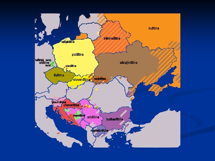 n Dělení slovanských jazyků: západoslovanské – čeština, slovenština, polština, lužická srbština n východoslovanské – ruština, běloruština, ukrajinština n jihoslovanské – chorvatština, srbština, bosenština, černohorština, slovinština, makedonština, bulharština n
