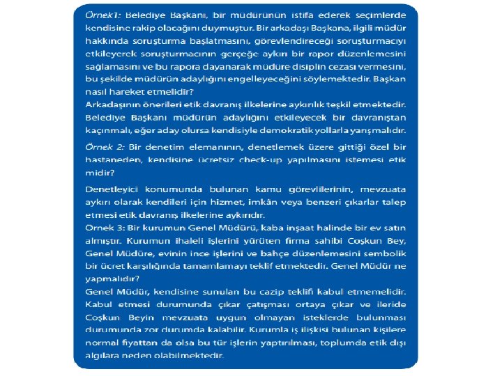 Etik Davranış İlkeleri şunlardır: • • • • • Görevin yerine getirilmesinde kamu hizmeti bilinci Halka hizmet bilinci Hizmet standartlarına uyma Amaç ve misyona bağlılık Dürüstlük ve tarafsızlık Saygınlık ve güven Nezaket ve saygı Yetkili makamlara bildirim Çıkar çatışmasından kaçınma Görev ve yetkilerin menfaat sağlamak amacıyla kullanılmaması Hediye alma ve menfaat sağlama yasağı Kamu malları ve kaynaklarının kullanımı Savurganlıktan kaçınma Bağlayıcı açıklamalar ve gerçek dışı beyan Bilgi verme, saydamlık ve katılımcılık Yöneticilerin hesap verme sorumluluğu Eski kamu görevlileriyle ilişkiler Mal bildiriminde bulunma