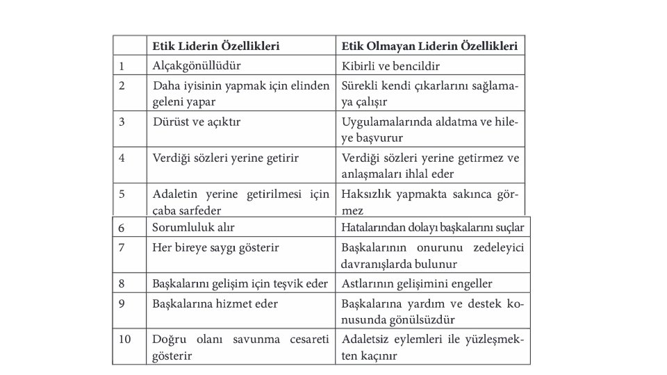 Etik liderler etik ilke ve davranışlarıyla ku rumda etik deg erlerin bir ku ltu r haline gelmesini sag layarak, o g ret menler ve o g renciler ic in gerc ek bir rol modeli olarak hizmet ederler. Etik davranıs ı alıs kanlık haline getiren liderlerle etkiles im ic inde olan izleyenler, kendileri de sosyal o g renme yoluyla bu alıs kanlıkları kazanmakta ve etik davranıs lar sergilemektedirler. Zanderer ( 1992) etik lider ile etik olmayan liderin o zelliklerini as ag ıdaki gibi ortaya koymus tur (Akt. Mihelic, Lipicnik ve Tekav. Cic, 2010):