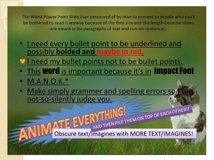 � Grafik içeren slaytlar animasyon içermemeli; grafik slaytta oynamamalı ya da parça gelmemeli, sabit durmalıdır. � Kullandığınız görseller, sunum yapacağınız salonun en arka sırasından da rahatlıkça görülebilir büyüklük ve netlikte olmalıdır. � Slaytlarınızdaki boş alanları görsellerle doldurmaya çalışmayın, boş alanlar mevcut içeriğin ön plana çıkmasına katkı sağlar. � Animasyon, video, film kullanımı sunum konunuza göre oldukça etkili araçlardır. Ancak çok yoğun ya da konuyla ilgisiz kullanımları izleyicinin dikkatini dağıtır.