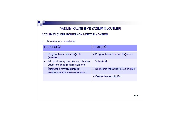 FP • olarak hesaplanmaktadır. Yazılımın basit-ortakarmaşık oluşu tahmin yoluyla kestirilmektedir. Yazılımın 14 özelliğine göre (Tablo 2. 2) "karmaşıklık düzeltme değeri" ( fi) bulunarak da • FP = Sayı toplamı (0. 65 + 0. 01 Fi) (i = 1. . 14) • fonksiyon noktası hesaplanabilmektedir.