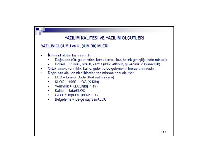 • • Verimlilik = FP/kişi * ay Kalite = Hata/FP Gider = Toplam gider/FP Belgeleme = Belge sayfası/FP