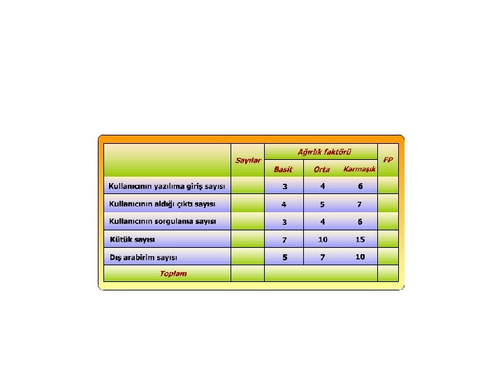 • FP = sayısı * ağırlık faktörü • FP = Sayı toplamı (0. 65 + 0. 01 Fi) (i = 1. . 14)