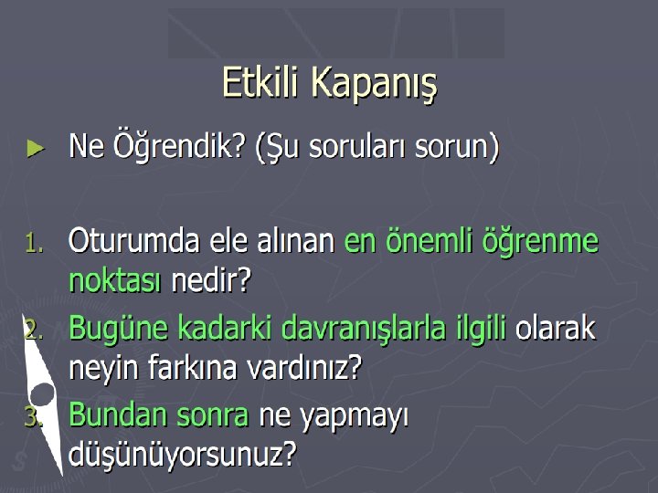 SALONA HAKİM OLMA TÜYOLARİ • Erken gelin ve tüm salonu gezin, • Oturma düzenini, • Kağıtlı yazı tahtasını, • Projektör konumlamasını ve diğer eğitim metaryellerini nasıl ve nerede kullanacağınızın provasını ve düzenlemesini yapın