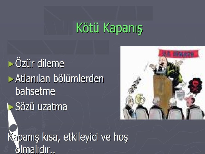 KÜRSÜNÜN AZİZLİĞİ • Kürsünün önünde durun, arkasında değil. • Aksi taktirde salondakiler sadece bedeninizin üstünü görür. • Kendinizi arkada savunmada hissedebilirsiniz, notlarınıza bakar ellerinizi yaslarsınız. Ancak kürsü arkasında kalmak sizi “güçsüz” gösterir ve kendinize güveniniz olmadığı mesajını yansıtır