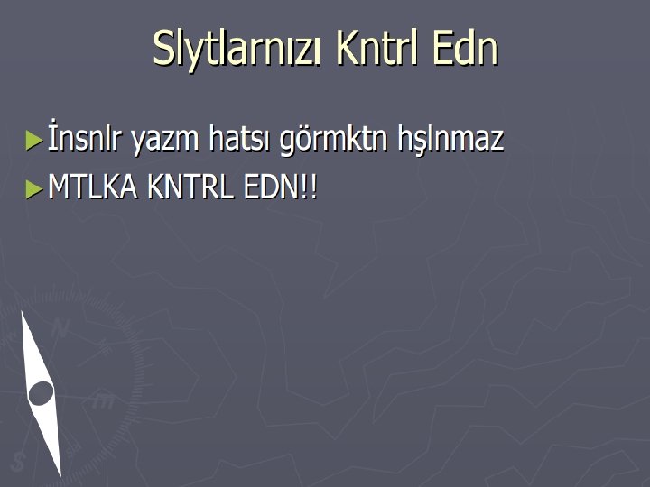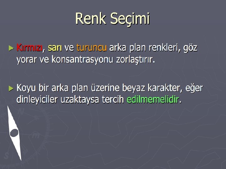 • İyi bir slayt yapmak için üç ilkeye uyulmalıdır. o Her yansıda bir kavram o Metin 7 veya 8 satırla sınırlanmalıdır o Her satırda da 7 veya 8 kelimeyi aşmamalıdır. o Vurgu için harf büyüklüğünde değişiklik