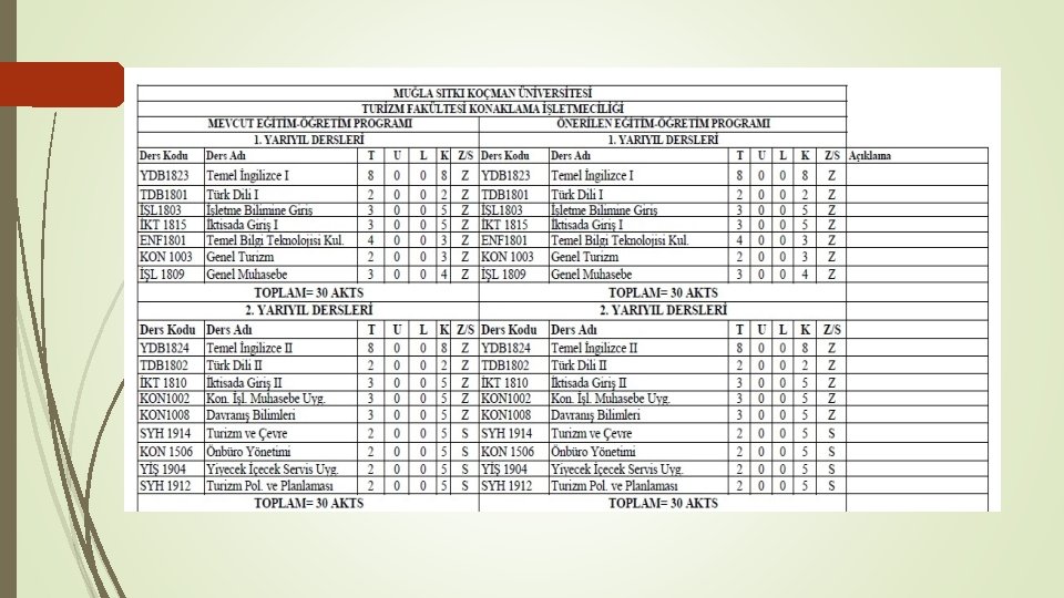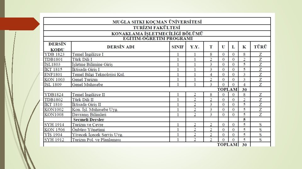 Ders Kodları Derslerin Ait Olduğu Bölüm, Yıl- Yarıyıl ve Türü hakkında bilgi verir. KON 1003 Genel Turizm dersi Konaklama İşletmeciliği Bölümü 1. Sınıf 1. Yarıyılı zorunlu dersidir. YİŞ 3508 Uluslararası Mutfaklar Yiyecek ve İçecek İşletmeciliği Bölümü 3. Sınıf 6. Yarıyılı seçmeli dersidir. SYH 2802 Turizm Pazarlaması Seyahat İşletmeciliği Bölümünün diğer Bölümlerin 2. Sınıf 4. Yarıyıla servis ettiği zorunlu derstir. KON 2904 Turizm İşletmelerinde İletişim ve Müşteri İlişkileri Konaklama İşletmeciliği Bölümünün diğer Bölümlerin 2. Sınıf 4. Yarıyıla servis ettiği seçmeli derstir.
