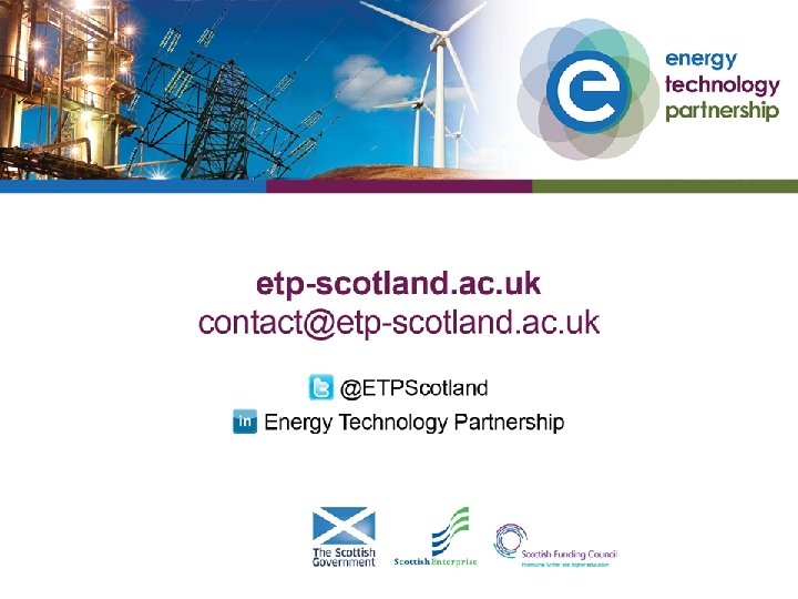 ETP Knowledge Exchange Network Services offered: Partners sought: 10 K industry engagement fund for small, collaborative projects using university resources Scottish SMEs with ideas for low carbon energy projects A team of 7 BDMs acting as 1 st point-of-contact & facilitators for Knowledge Exchange and funding applications Scottish academics with expertise & capabilities in applied energy research Cross-sectoral collaborators on wider energy initiatives Cross-sectoral special interest groups for collaboration etp-scotland. ac. uk