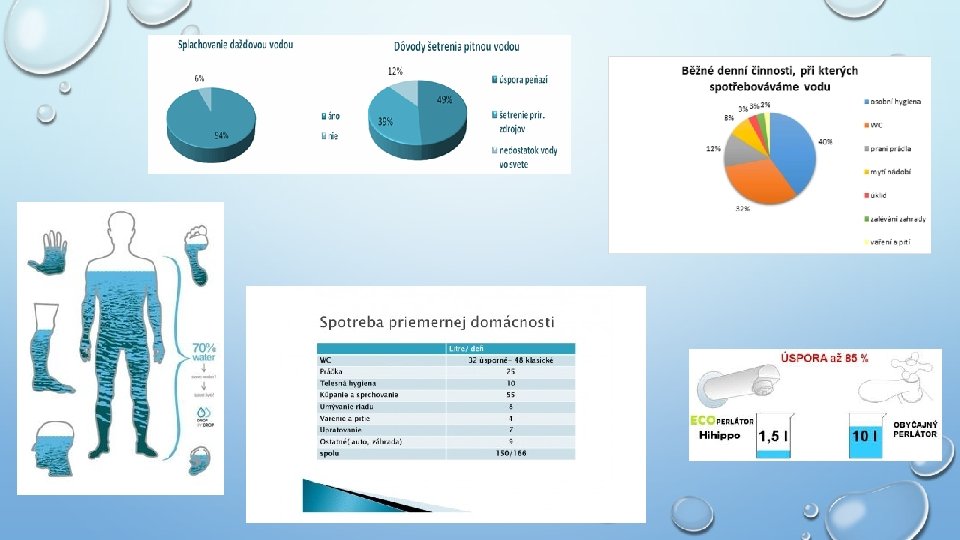 AKO ŠETRIŤ VODU? 13 TYPOV AKO NAOZAJ EFEKTÍVNE ŠETRIŤ VODU • DAJTE PREDNOSŤ SPRCHE NAMIESTO KÚPEĽA, PRÍPADNE SKÚSTE NAHRADIŤ VAŠU BEŽNÚ SPRCHOVACIU HLAVICU ÚSPORNOU, DOKÁŽE UŠETRIŤ AŽ 60% VODY • AK MÁTE DOMA KVAPKAJÚCE KOHÚTIKY, OPRAVTE ICH. ZA ROK VÁM TOTIŽ MÔŽE NAKVAPKAŤ AŽ 2 700 LITROV VODY ČO SA ODRAZÍ NA VAŠICH NÁKLADOCH • SKLADUJTE VODU V CHLADNIČKE, ABY STE PRE POHÁR STUDENEJ VODY NEMUSELI NECHÁVAŤ ODTIECŤ VEĽKÉ MNOŽSTVO VODY • NEVYLIEVAJTE PREBYTOČNÚ VODU, STÁLE JU MÔŽETE VYUŽIŤ NA ZALIEVANIE KVETOV V ZÁHRADE ČI ČISTENIE RÔZNYCH PREDMETOV • POKIAĽ MÁTE V PLÁNE STAVAŤ DOM, NAPLÁNUJTE SI POSTAVIŤ ZBERNÉ ZARIADENIE NA DAŽĎOVÚ VODU A POTRUBIE NA ROZVOD ÚŽITKOVEJ DAŽĎOVEJ VODY. TÚTO VODU MÔŽETE POUŽIŤ NA ZAVLAŽOVANIE VAŠEJ ZÁHRADY