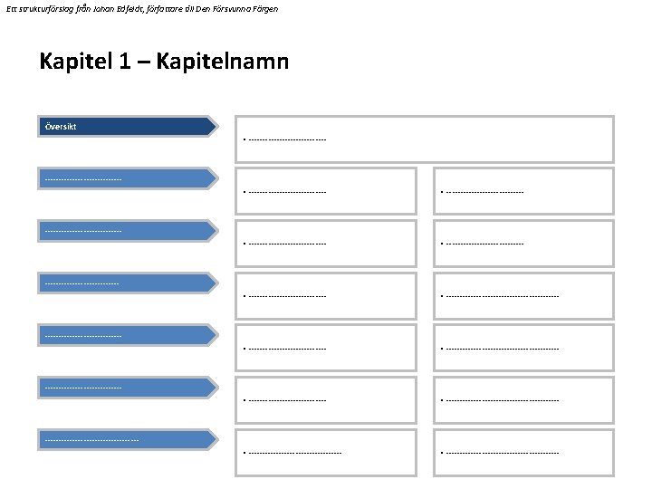Ett strukturförslag från Johan Edfeldt, författare till Den Försvunna Färgen Kapitel 1 – Nu börjar berättelsen - exempel Översikt • Beskriv översiktligt vad kapitlet handlar om Viktig händelse 1 • Beskriv den viktigaste händelsen i detta kapitel • ---------------------------- • ----------------------------------------- • --------------------- • ----------------------------------------- ------------------------