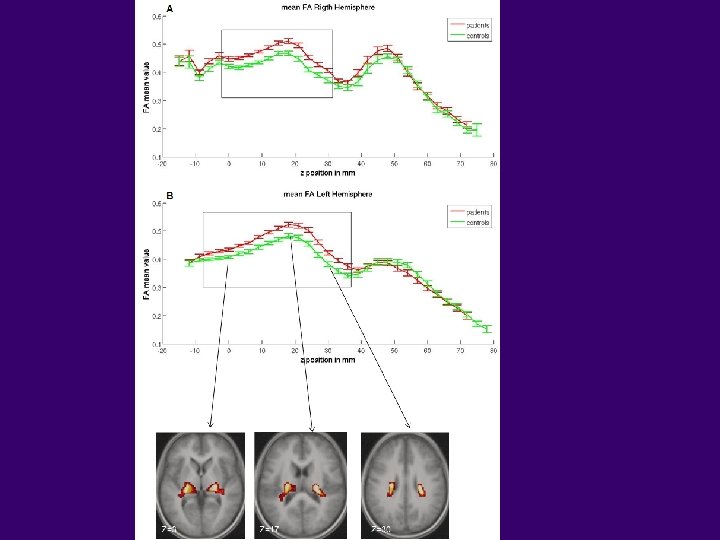 Methode : Fiber quantification • Carte statistique utilisée pour quantifier la valeur de FA selon l’axe z dans l’espace normalisé – Carte probabilistique de la substance blanche superposée sur la carte de FA normalisée, – FA calculée : • FA : ∑(Pi x FAi)/ ∑Pi – Pi : probilité du i-th voxel occupée par le fx divisé par le nombre total de sujets – FAi : valeur de FA dans le i-th voxel • Differences entre patients et controles le long de l’axe supéro inférieur z : test t indépendant (P < 0. 05)
