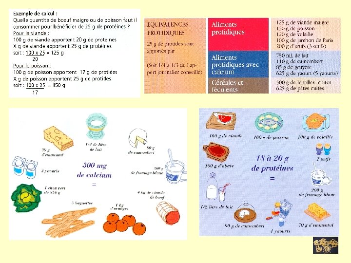-Exemple : un verre de 0, 25 L de lait entier (1 Kg = 1 L = 1000 g donc 0, 25 L équivaut à 0, 25 Kg=250 g) Utiliser une table d’équivalence pour indiquer la masse de protéines et calcium contenues dans ce verre. - 25 g de protéines sont apportées par 750 g de lait entier donc un verre de 0, 25 L(250 g) apporte 250 x 25/750 = 8, 33 g prot - 300 mg de calcium sont apportées par 250 g de lait entier donc un verre de 0, 25 L(250 g) apporte 250 x 300/250 = 300 mg de calcium -Proposer un aliment à équivalence calcique et un à équivalence protéique pour les 0. 25 L de lait. -équivalence calcique : 5 baguettes apportent 300 mg de calcium comme les 0, 25 L lait entier (table entière) -équivalence protéique : 3 œufs apportent 25 g de protéines soit l’équivalent de 750 m. L de lait : 250 ml de lait = 1 œuf