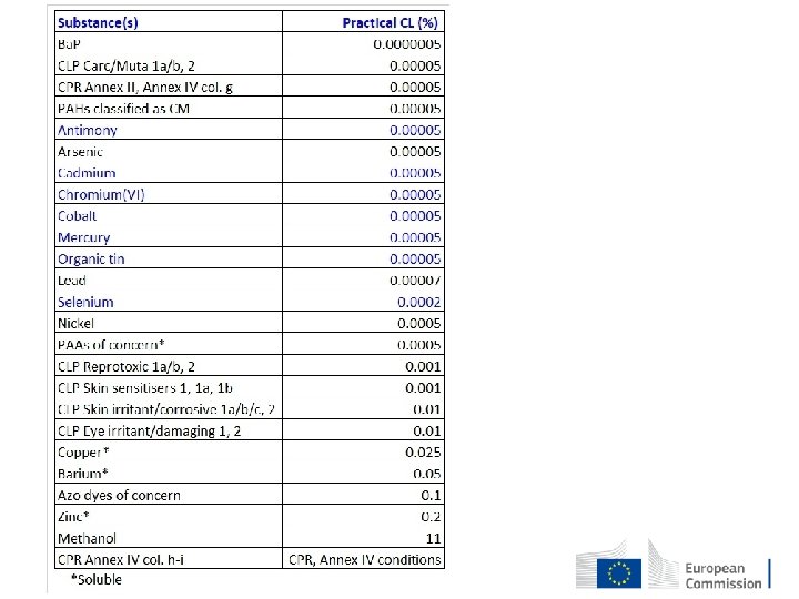 Impurities in Res. AP(2008)1 Table 3 All the limits were discussed by ECHA Risk assessment Committee Co. E Res. AP CL Risk-based CL Practical CL Comments Cadmium 0. 00002 Should not contain 0. 00005 as for carc/muta Chromium (VI) 0. 00002 Should not contain 0. 00005 as for carc/muta Cobalt 0. 00002 Should not contain 0. 00005 as for carc/muta Mercury 0. 00002 Should not contain 0. 00005 as for Annex II CPR Antimony 0. 0002 Should not contain 0. 00005 as for Annex II CPR Selenium 0. 0002 as in Co. E Res. AP 0. 00005 as for carc/muta Substance(s) Organic tin (0. 005 for tin) Should not contain