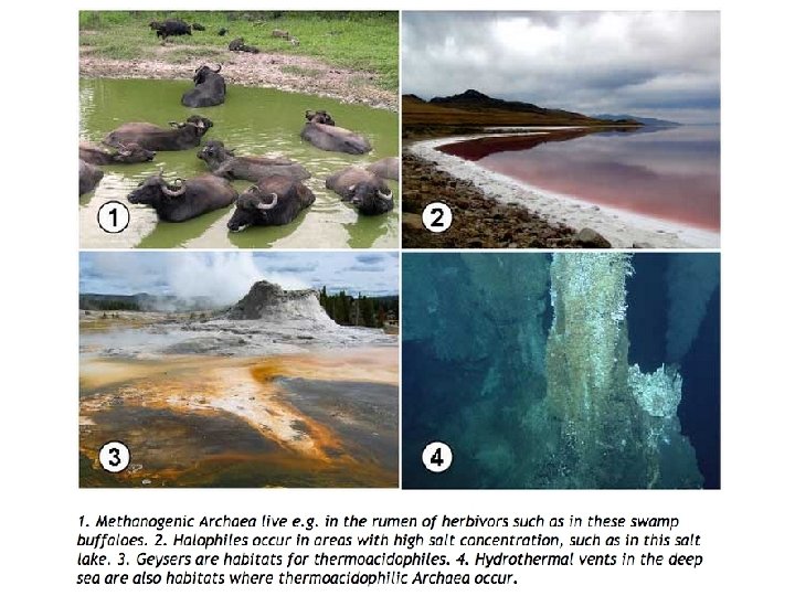 1. Archaebacteria • DNA shows a closer evolutionary relationship to eukaryotes • Many archaebacteria live in extreme environments. • Methanogens live in oxygen-free environments (ex. thick mud & animal digestive tracts) • Halophiles live in salty environments • Thermophiles live in hot environments (ex. hot springs)