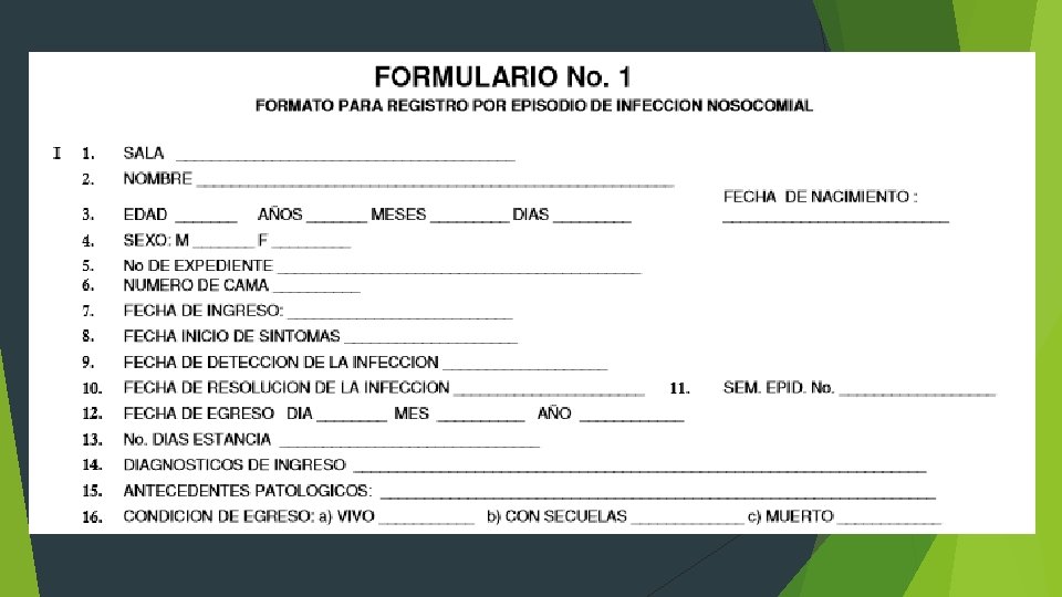 INTEGRANTES DEL COMITÉ DE INFECCIONES q Medicina Interna q Enfermedades Infecciosas q Gineco-obstetricia q Servicio de Farmacia q Cirugía q Pediatría q Anestesia q q q Administración de Servicios Generales q Sección de Central de Equipos q Sección de Estadística o jefe(a) de la Unidad de Análisis Patología q Servicio de Limpieza Microbiología Clínica q Servicio Dietética q Ortopedia q Neurocirugía q Epidemiología q Director de Atención Médica q Radiodiagnóstico q Odontología q Enfermería