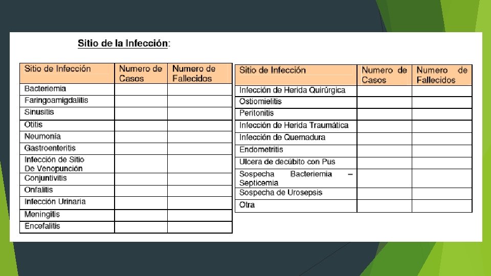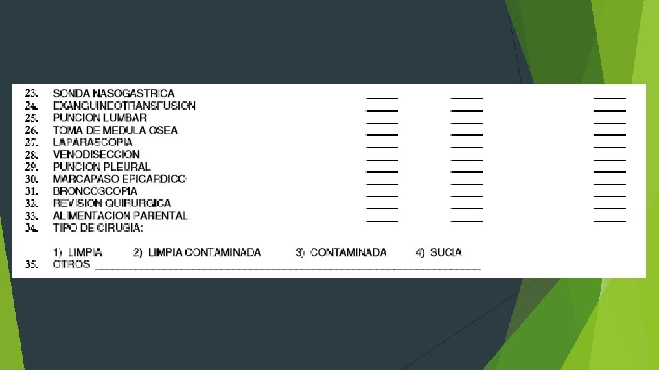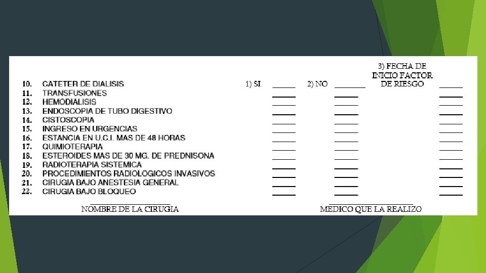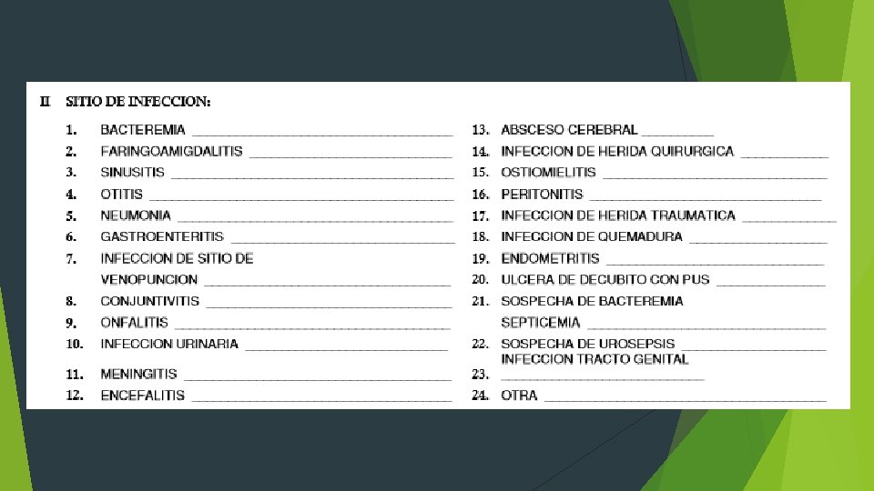 Hepatitis viral INFECCIÓN INTRAABDOMINAL ENDOMETRITIS INFECCIÓN DE EPISIOTOMIA ONFALITIS INFECCIÓN DEL MUÑON VAGINAL INFECCIONES DE INCISIONES DE HERIDAS QUIRÚRGICAS INFECCIONES PROFUNDAS DE HERIDAS QUIRÚRGICASINFECCIONES DE PIEL INFECCIONES DE TEJIDO BLANDOINFECCIONES ÚLCERA DE DECUBITO INFECCIONES DE QUEMADURAS INFECCIÓN DE LA ARTICULACIÓN Y BURSA OSTEOMIELITIS INFECCIÓN DEL ESPACIO DE LOS DISCOS VERTEBRADOS
