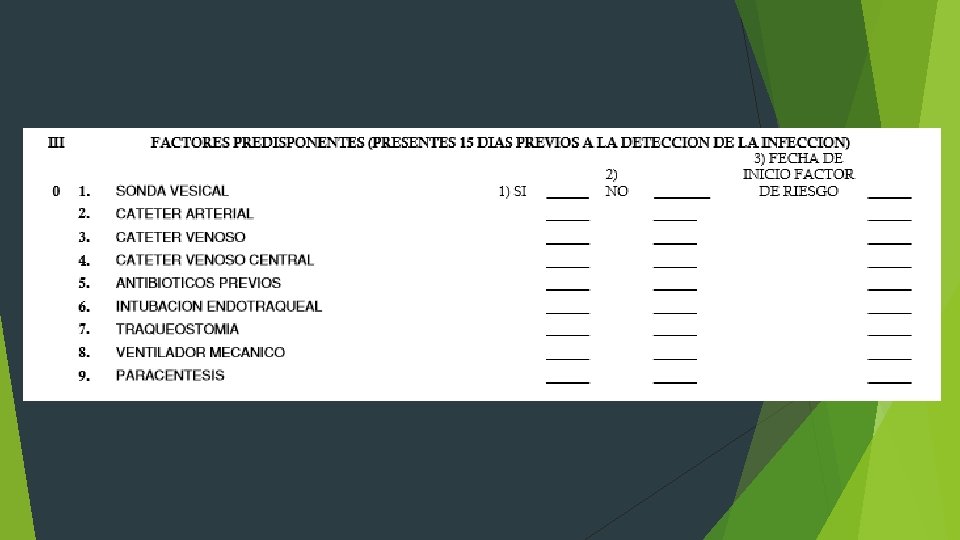 Definición de factores de riesgo de IIH Guía de supervisión para la identificación de factores de riesgo en la prevención y control de las IIH: Información general Manejo de insumos Manejo de soluciones Manejo desechos peligrosos Manejo de material y equipo estéril Higiene y desinfección de áreas Conocimientos y prácticas del personal de la sala en la prevención y control de las IIH: Criterios que utiliza el personal de la sala en el lavado simple de manos Momento en que el personal de la sala realiza el lavado de manos