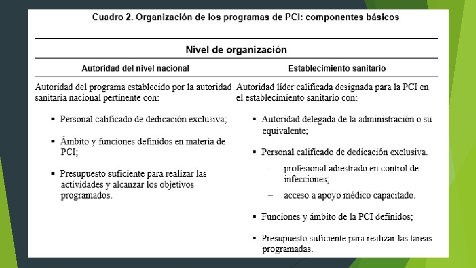 Componentes básicos de los programas de PCI: Descripción 3. 1 Organización de los programas de PCI Marco de las deliberaciones La organización de programas de PCI debe establecerse en los planos nacional y local, con designación de personas, objetivos y funciones claros y una determinación clara de responsabilidades.