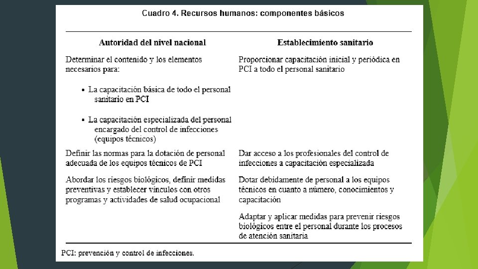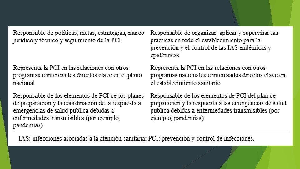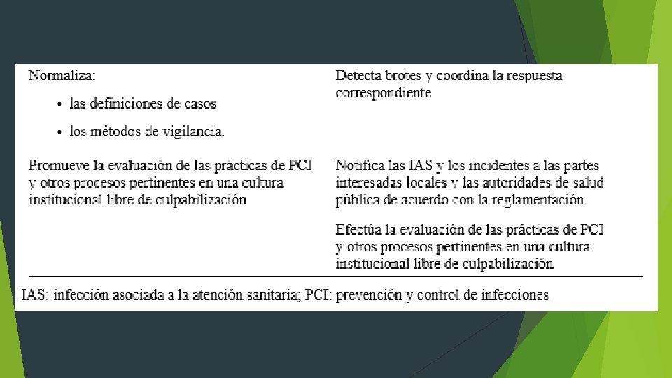 3. 1. 1 Deben establecerse los objetivos de las actividades y definirse el ámbito de éstas Los objetivos deben incluir al menos: Metas para infecciones endémicas y epidémicas Observancia deseada de procesos y prácticas de eficacia conocida en la prevención de las IAS Las funciones de la PCI incluyen las siguientes: Vigilancia de las IAS Técnicas asépticas eficientes Prácticas preventivas eficaces Gestión de brotes Capacitación de personal sanitario Evaluación de prácticas de PCI Suministros suficientes Debe especificarse la relación entre las actividades de PCI y otras actividades importantes.