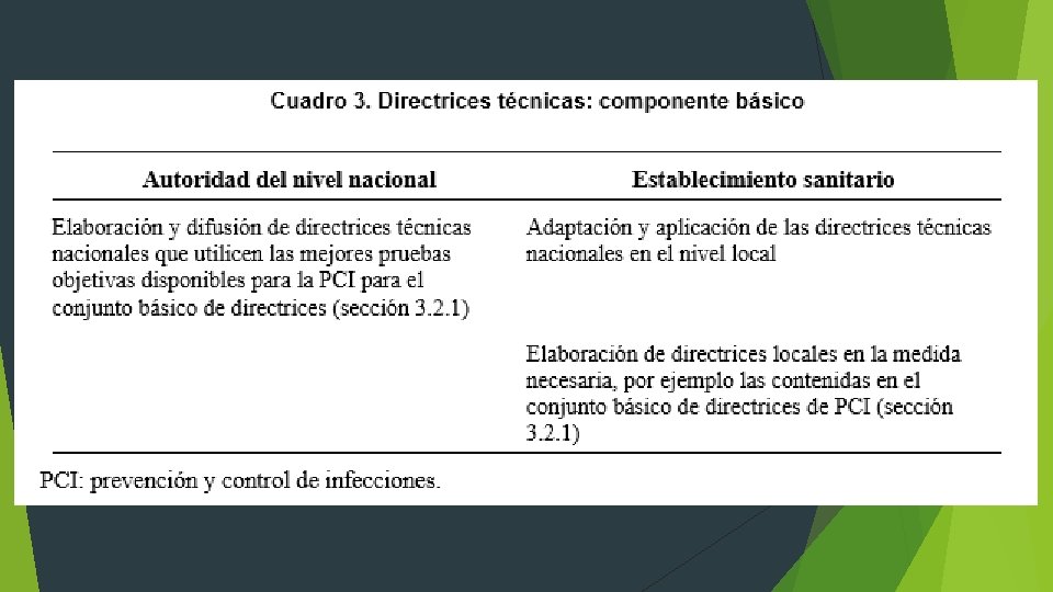 3. 2 Directrices técnicas 3. 2. 1 El "conjunto básico de directrices de PCI" incluye lo siguiente: Precauciones habituales Detección temprana de la enfermedad y precauciones de aislamiento Técnicas asépticas y gestión de dispositivos para los procedimientos clínicos Gestión de desechos 3. 2. 2 Las cuestiones básicas relacionadas con la salud del personal sanitario incluyen las siguientes: Pruebas de detección previas y posteriores al empleo Vacunaciones