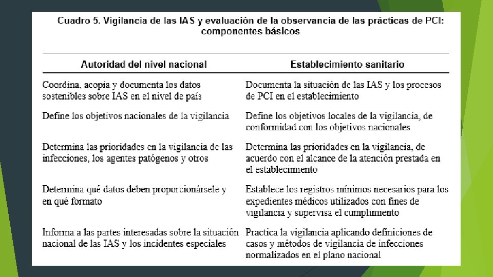 3. 4 Vigilancia de las IAS y evaluación de la observancia de las prácticas de PCI 3. 4. 1 Vigilancia de las IAS La vigilancia debe tener objetivos claros. Como mínimo, debe proporcionar información para lo siguiente: Describir la situación de las infecciones asociadas a la atención de salud (es decir, incidencia o prevalencia, tipo, etiología, gravedad, carga de morbilidad atribuible) Determinar las poblaciones, los procedimientos y las vías de exposición de alto riesgo Detectar precozmente los brotes Evaluar el impacto de las intervenciones 3. 4. 2 Evaluación de la observancia de las prácticas de PCI
