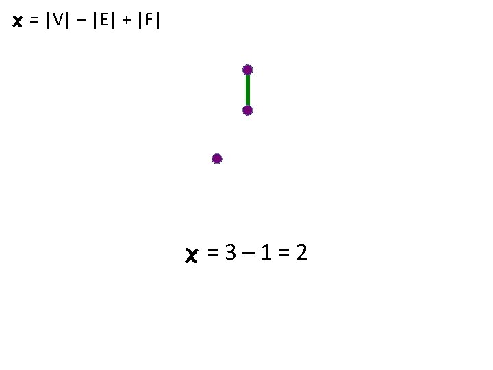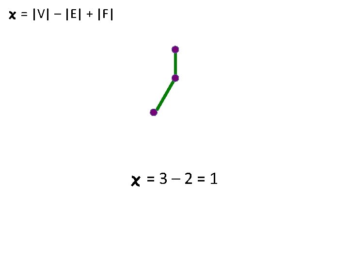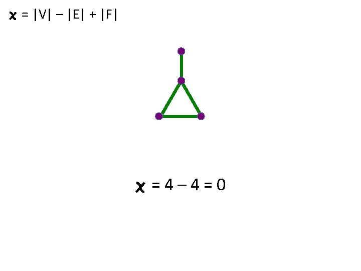 Euler characteristic (simple form): = number of vertices – number of edges + number of faces Or in short-hand, = |V| - |E| + |F| where V = set of vertices E = set of edges F = set of faces & the notation |X| = the number of elements in the set X.