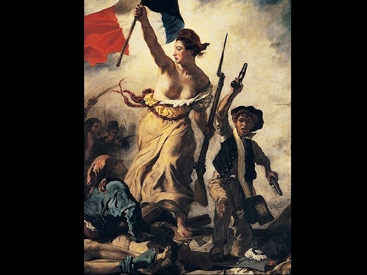 Eugène Delacroix Liberty Leading the People • Delacroix was known as a true colorist and painted with an improvisational style. • Liberty Leading the People shows the passion and energy of the Revolution of the 1830 s. The images is based on the Parisian uprising against Charles V. • The painting shows an allegorical personification of Liberty. She holds the tri-color banner of the 4 th republic as well as a Phrygian cap (symbol of a freed slave in antiquity). • There images also shows street boy, intellectual dandy, works all with weapons. • Notre Dame is the background marking place as Paris.