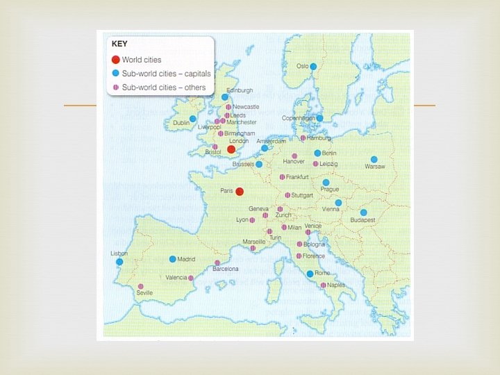 URBAN HIERARCHY Large metropolises of global importance (Paris and London). Metropolises of continental importance (Madrid, Milan, Berlin). National metropolises (Lisbon, Dublin, Naples. . . ). Medium-sized and small cities (Verona, Strasbourg, Toledo).
